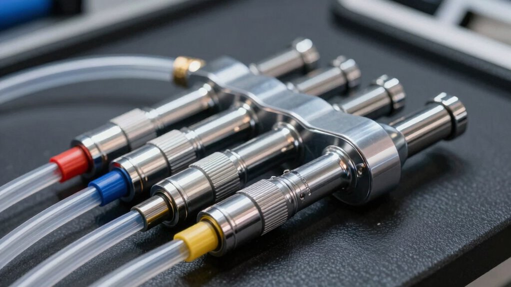 Vacuum fill tools work by creating a sealed environment around your cooling system, which allows you to remove air and fill it quickly and efficiently. When you activate the tool, it reduces the pressure inside the system, causing air bubbles to expand and escape. As the pressure drops, coolant flow is enhanced, guaranteeing the system fills with coolant without trapped air pockets. Pressure regulation is essential here; it maintains the right balance to prevent over-pressurization or vacuum loss, making the process safer and more effective. Once the air is evacuated, the tool allows coolant to flow into the system seamlessly, filling it rapidly. This method minimizes the chance of air pockets, improves heat transfer, and assures your cooling system operates at peak efficiency. Proper Pressure regulation is crucial for achieving optimal results during vacuum filling.