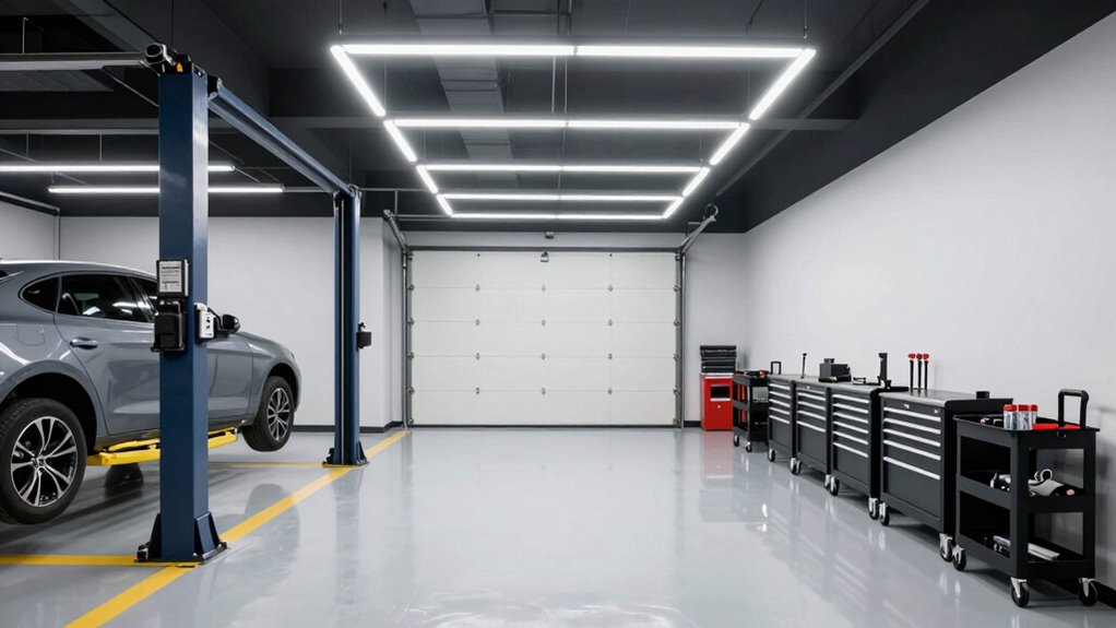 Effective lighting and clear signage are essential for maintaining a smooth workflow in your garage. Your lighting strategy should guarantee all work areas are well-lit, reducing errors and speeding up diagnostics. Use bright, focused lights over workbenches and vehicle bays, and consider overhead LED fixtures for even illumination. Proper signage placement guides staff efficiently, minimizing confusion and delays. Place signs at eye level near key zones, such as tool stations, parts storage, and vehicle pathways. Use clear, simple labels and visual cues to direct traffic and identify equipment quickly. This combination of strategic lighting and well-positioned signage keeps your team focused, minimizes unnecessary movement, and helps maintain a steady, efficient service flow.