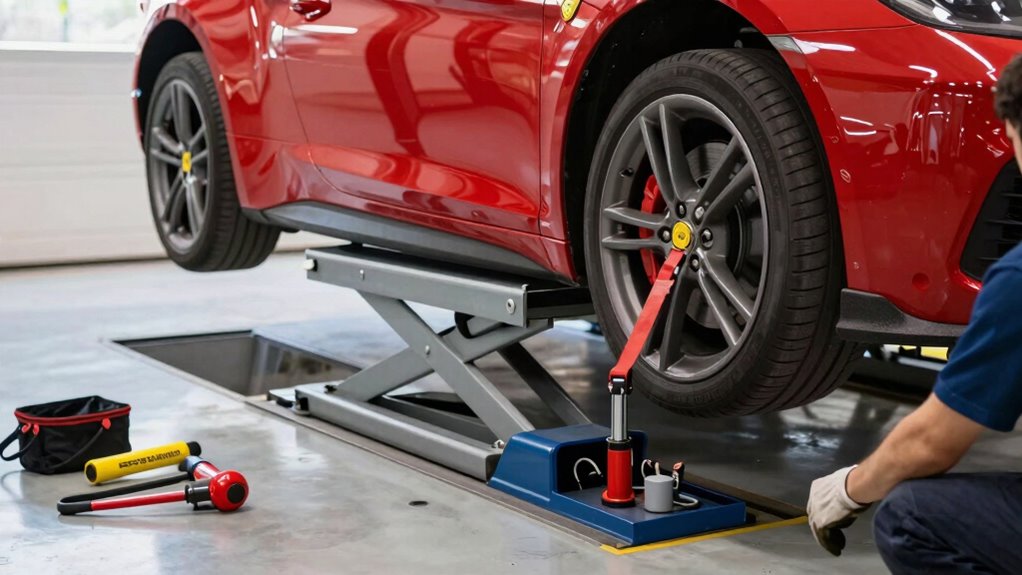 Checking that your vehicle fits on a portable car lift is essential for safe and effective operation. To ensure lift compatibility, you need to take into account your vehicle’s dimensions and the lift’s capacity. First, measure your vehicle’s length, width, and height accurately. Second, verify that the lift’s maximum weight capacity can handle your vehicle’s weight. Third, compare your vehicle’s dimensions with the lift’s lifting platform size to confirm proper fit. Remember, incompatible vehicle dimensions can compromise safety and damage your vehicle or lift. Always check the lift’s specifications and ensure your vehicle aligns with these measurements before lifting. Doing so guarantees a safe, secure, and efficient lifting process, minimizing risks and maximizing your equipment’s lifespan. Additionally, understanding lift compatibility can help you select the most suitable model for your needs. It’s also beneficial to familiarize yourself with herbal properties to support your overall wellness while working with your equipment. Being aware of safety guidelines specific to portable car lifts can further help prevent accidents and ensure a smooth lifting experience. Moreover, regularly inspecting your lift for wear and tear can extend its longevity and maintain safety standards. Being mindful of inspection routines ensures ongoing safety and optimal performance of your equipment.