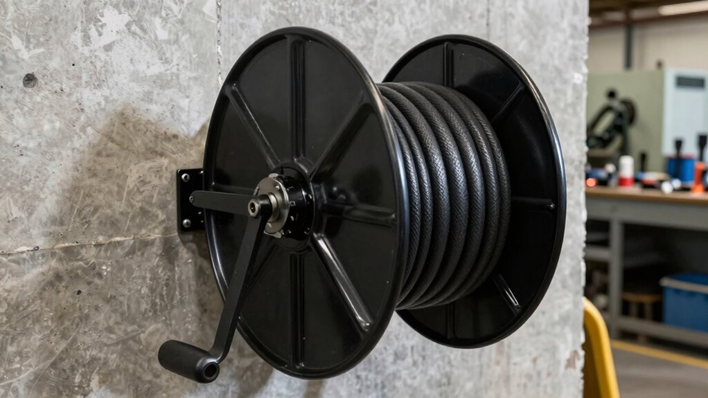 To keep your heavy-duty air hose reel in top shape, you need to regularly inspect the hoses for damage and wear. Using proper storage techniques and safe operation practices helps prevent accidents and extends the reel’s lifespan. Follow these simple steps to guarantee your reel remains reliable and easy to use.