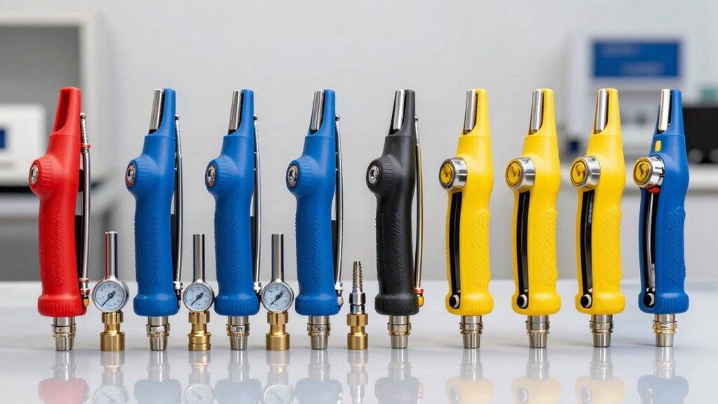 When selecting an air-powered grease pump kit, ease of operation can make a significant difference in how efficiently and comfortably you work. Ergonomic controls that allow for one-handed operation reduce fatigue, especially during long tasks. Features like quick-connect fittings and intuitive control valves simplify startup and shut-off, saving time and preventing frustration. Clear pressure gauges enable easy monitoring and adjustments, ensuring accurate lubrication without guesswork. A lightweight, well-balanced design improves handling and maneuverability, reducing effort during use. Automated features, such as adjustable flow rates and pressure settings, allow precise control with minimal adjustments, making the process smoother. Overall, a kit designed for easy operation enhances productivity and safety, making your lubrication tasks less taxing and more accurate.