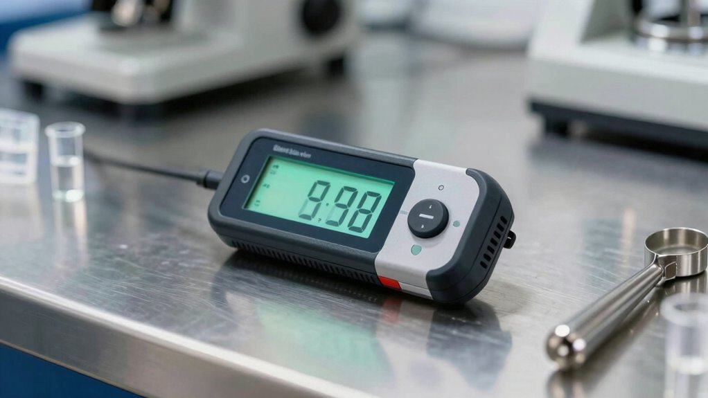 A typical digital coolant refractometer battery lasts around 6 to 12 months with regular use. I recommend checking the manufacturer’s specifications for your specific model, as battery life can vary. To guarantee accurate readings, I suggest keeping spare batteries handy and turning off the device when not in use. Proper maintenance helps prolong battery life and keeps your measurements reliable.