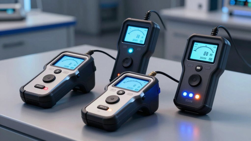 When evaluating electronic battery testers with conductance technology, durability and portability are essential factors that can’t be overlooked. A rugged, shock-resistant casing is vital for withstanding tough environments, guaranteeing the device lasts over time. Portability is equally important; a lightweight design, ideally under 2 pounds, makes it easy to carry and use in various locations. Compact dimensions, such as less than 8 inches in length, help test in tight spaces like vehicle engine bays. High-quality materials and reinforced construction further extend the tester’s lifespan, providing reliable performance day after day. Features like a built-in handle or ergonomic grip also improve handling, especially during field inspections. Balancing durability and portability ensures you get a reliable, convenient tool for all testing scenarios.