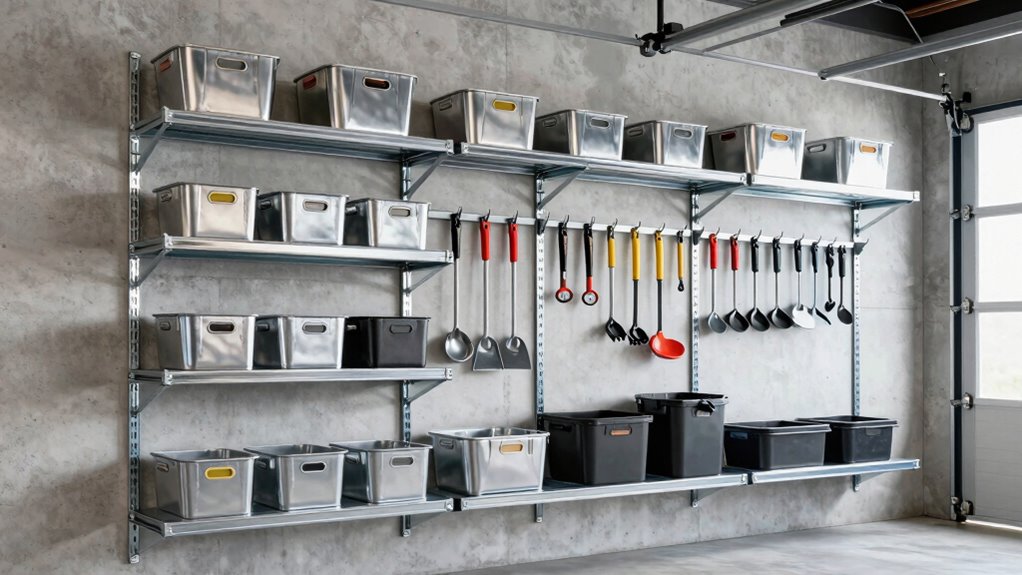 An adjustable and customizable garage wall storage system offers the flexibility to tailor your organization to your specific needs. With hooks, rails, or shelves that can be repositioned along the mounting track, you can easily accommodate tools of various sizes and shapes. Many systems allow you to add, remove, or rearrange components, giving you the freedom to create a setup that fits your evolving storage needs. The ability to change the height or spacing between hooks and shelves guarantees maximum use of vertical space and quick access to items. Plus, modular components that can be expanded or reconfigured over time make these systems highly adaptable. This versatility is ideal for organizing bulky tools, sports gear, garden equipment, and irregularly shaped items efficiently.