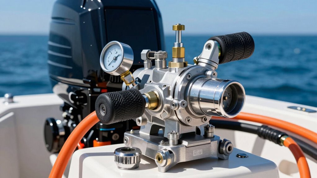 When selecting a gear oil pump, I focus on compatibility with my outboard model and the pump’s capacity to guarantee it meets my needs. Durability and ease of maintenance are also vital for long-term reliability, while adapter versatility can make the process smoother. Considering these factors helps me choose a pump that’s efficient, durable, and easy to use.