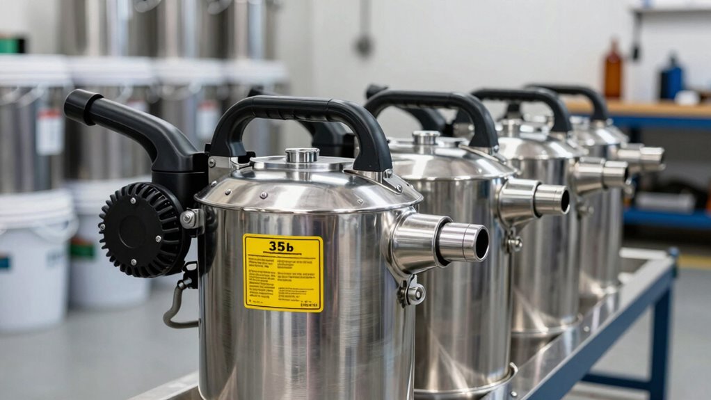 You might worry these pumps only fit 35 lb pails, but they can often work with other sizes too. I’ve used similar pumps with different container dimensions, and with a few adjustments, they perform well. Just check the pump’s inlet size and mounting style to verify compatibility. Most pumps are versatile, making them a great investment for various containers, saving you time and money.
