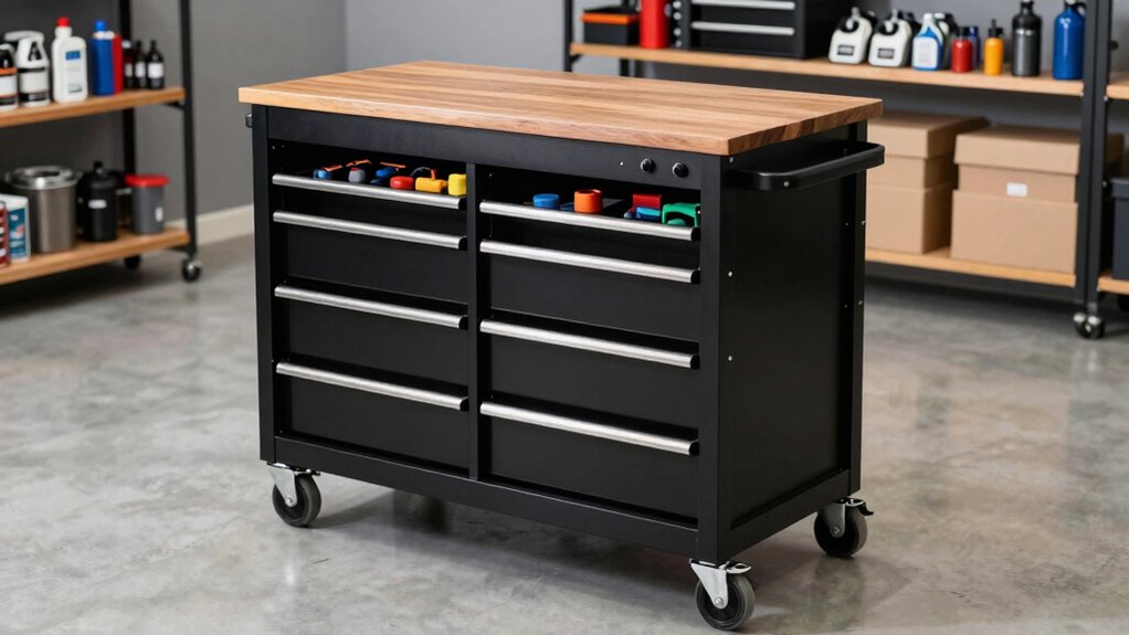 Choosing the right mobile workstation cart for your garage starts with understanding your storage capacity needs. I recommend evaluating how many tools and supplies you need to store now and in the future. Think about the size and volume of your equipment to determine the number and dimensions of shelves or drawers required. Pay attention to weight capacity, ensuring each compartment can handle your heaviest items safely. Consider whether adjustable storage options are necessary to accommodate changing tool sizes or new equipment. If you have bulky or heavy items, like power tools or large hardware containers, make sure the cart offers dedicated space for them. Finally, look for a design that allows quick access and an organized layout of your most-used tools, saving you time and effort.
