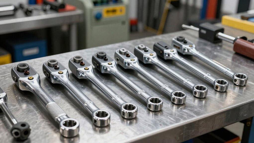 Noise and vibration are important factors to take into account because they directly impact operator comfort and safety. Pneumatic ratchet wrenches generate noise measured in decibels (dBA), with professional models designed to stay below 85 dBA to prevent hearing damage. Vibration, quantified in meters per second squared (m/s²), can cause fatigue and long-term health issues, so reducing it is essential. Many heavy-duty models include silencing technology or tuned exhaust systems to lower noise levels. Vibration dampening features like rubberized grips or internal isolators help minimize the transmission of vibrations to your hands and arms. Choosing a wrench with lower noise and vibration levels enhances comfort, improves safety, and helps guarantee compliance with occupational health standards.
