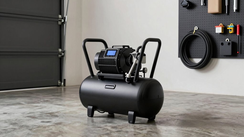 When selecting a quiet air compressor for your home garage, I consider factors like noise levels, portability, and power to guarantee it fits my needs. I also look at maintenance requirements, durability, and safety features to make a smart, long-lasting choice. Let’s explore what you should keep in mind to find the best fit for your workspace.