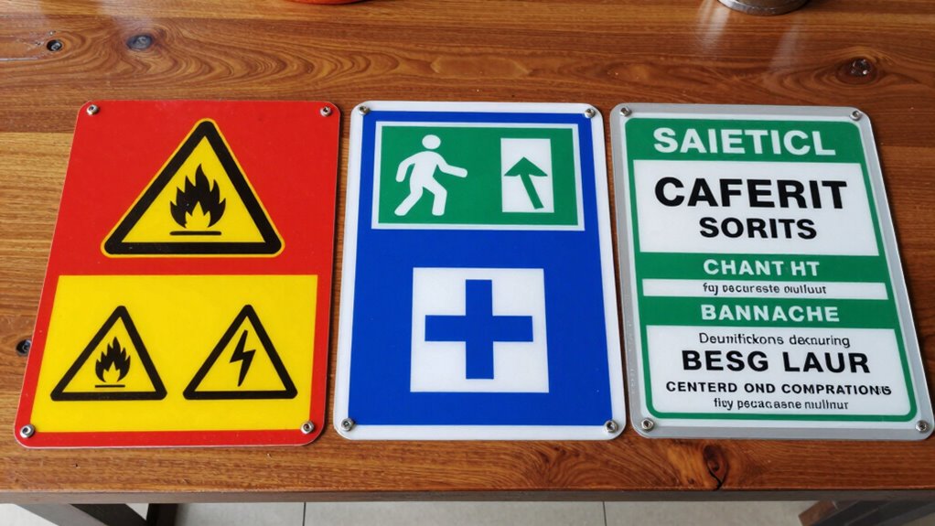 I find that safety signs built for extreme weather are surprisingly durable. They’re usually made from weather-resistant materials like high-grade plastics or metals, which withstand rain, snow, and intense sunlight. I’ve tested some in harsh conditions, and they’ve held up without fading or cracking. So, if you’re choosing signage for outdoor use, look for kits with UV protection and waterproof features to guarantee longevity.