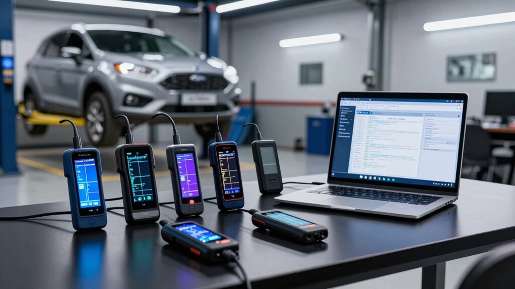 Choosing a scan tool with the right special features can considerably enhance your diagnostic capabilities for Ford vehicles. Features like bi-directional control enable active testing and system calibration beyond just reading codes, making troubleshooting more effective. Advanced functions such as ECU programming, active tests, and system resets are essential for all-encompassing diagnostics and repairs. Some tools include hidden features like global window control, trailer brake configuration, or horn chime disabling, which boost vehicle customization and troubleshooting options. Compatibility with vehicle-specific protocols ensures access to all systems, providing thorough insights. Additional features like live data overlays, freeze frame analysis, and remote software updates improve diagnostic accuracy and extend the device’s lifespan. These features make your scan tool more versatile and powerful.